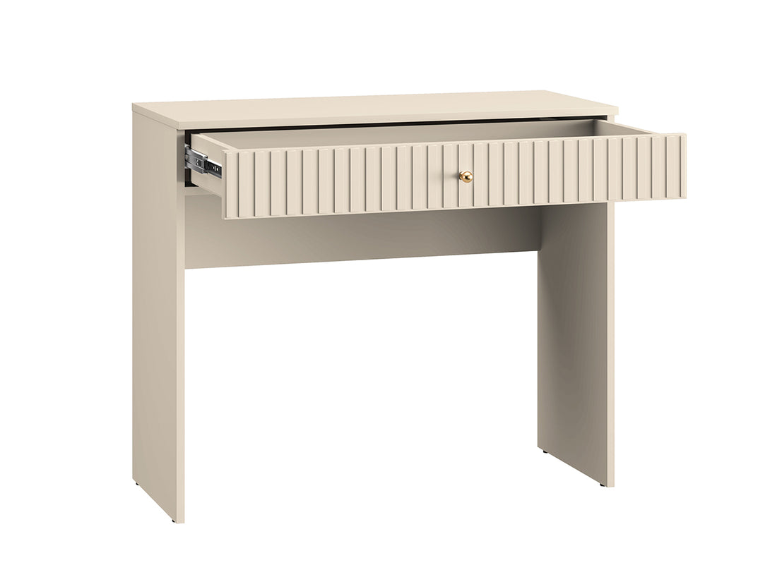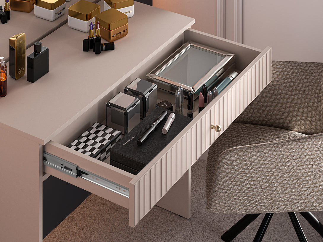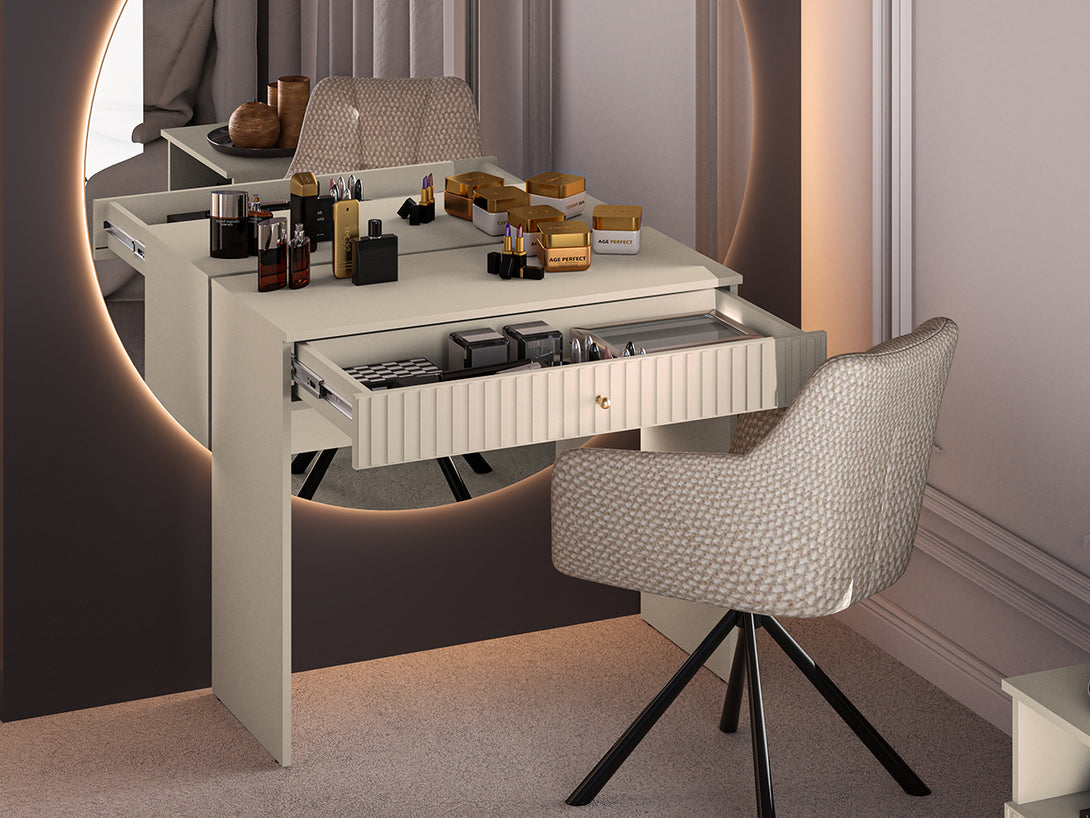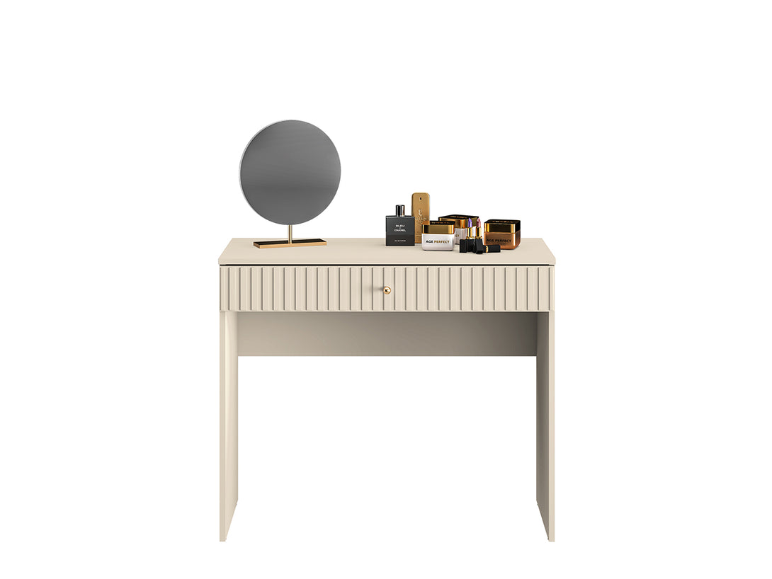 Der SOPHIE 0801 Schminktisch ist ein elegantes Möbelstück für Ihr Schlafzimmer, das Funktionalität und Stil in perfekter Harmonie vereint. Auf der großzügigen Ablagefläche finden Parfums, Kosmetikartikel oder dekorative Accessoires stilvoll ihren Platz. Die geräumige Schublade mit Vollauszug bietet zusätzlichen Stauraum für Ihre täglichen Essentials und sorgt für Ordnung im Alltag. Hochwertige Materialien, MDF-Fronten mit Fräsung und goldfarbene Griffe verleihen dem Tisch ein exklusives Aussehen. SOPHIE 0801 steht für moderne Eleganz und durchdachtes Design, das sowohl optisch als auch praktisch überzeugt.