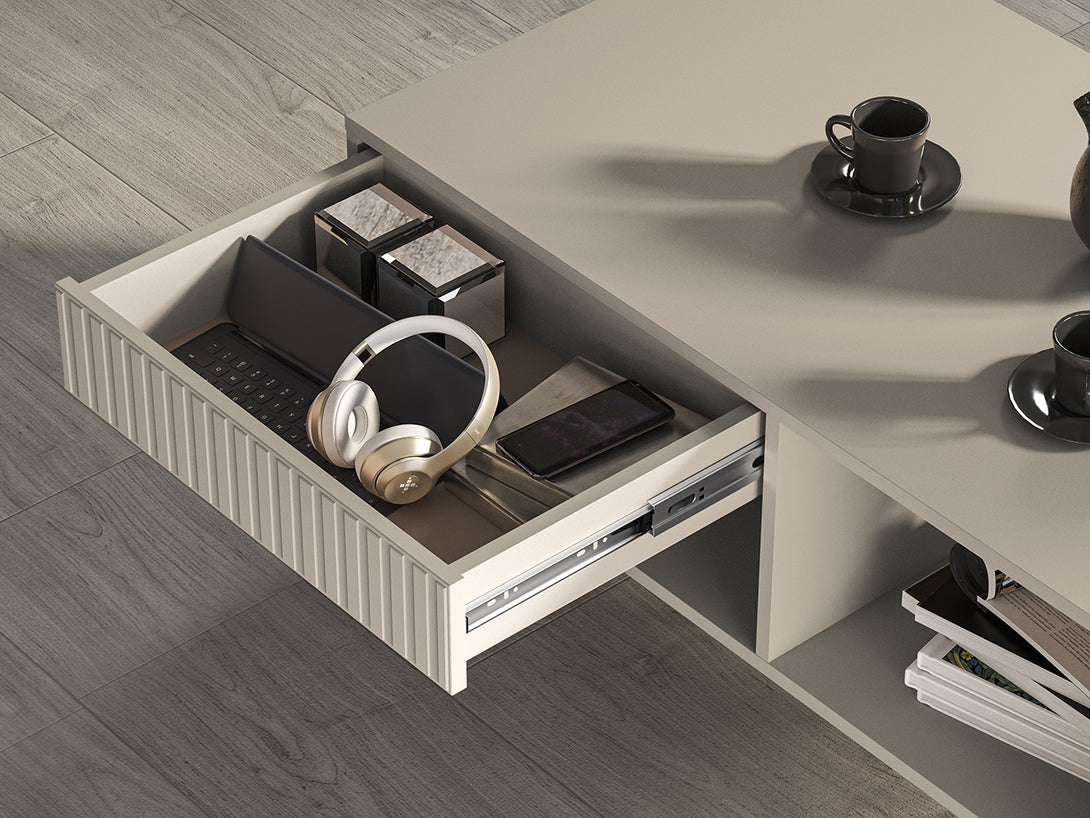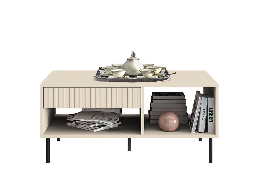 Der SOPHIE 10 Couchtisch ist ein eleganter Mittelpunkt für jedes Wohnzimmer. Auf der großzügigen Tischplatte finden Kaffeeservice, Snacks oder stilvolle Deko-Elemente ihren Platz. Zwei offene Fächer bieten Raum für Bücher und Wohnaccessoires, während eine praktische Schublade zusätzlichen Stauraum für Fernbedienungen oder Unterlagen bereitstellt. Die Kombination aus kaschmirfarbenem Dekor, gefrästen MDF-Fronten und filigranen schwarzen Metallfüßen unterstreicht das zeitgemäße Design und die hohe Verarbeitungsqualität. SOPHIE 10 verbindet Funktionalität mit moderner Eleganz und macht in jedem Wohnkonzept eine stilvolle Figur.