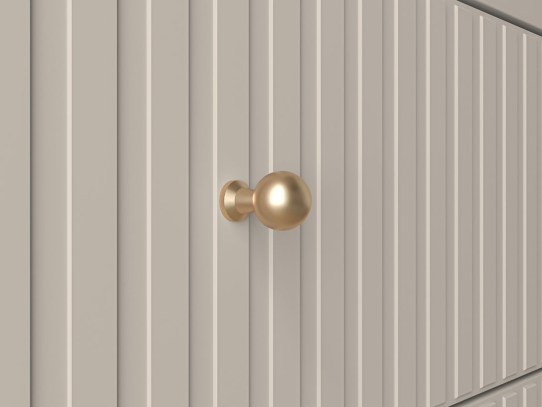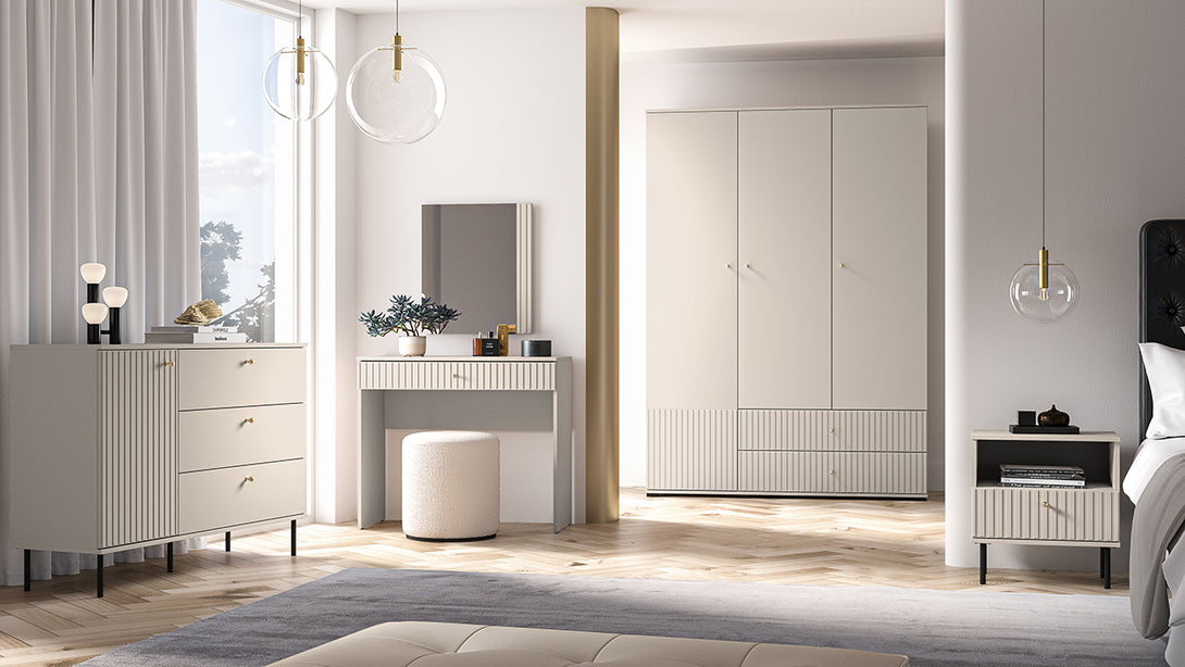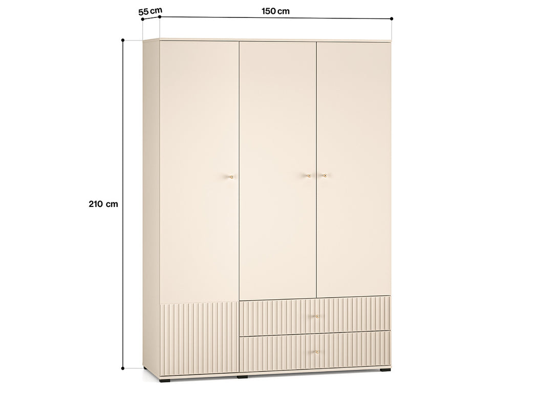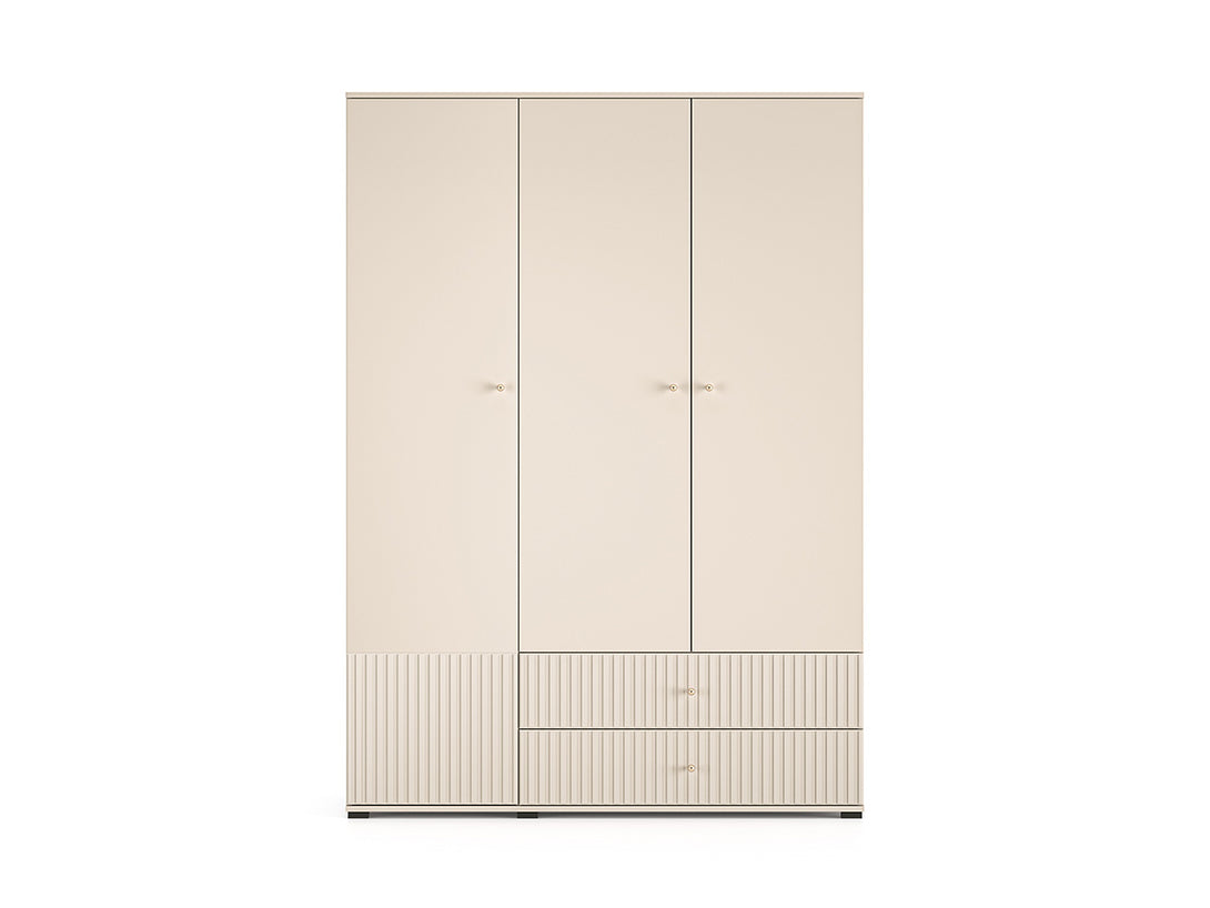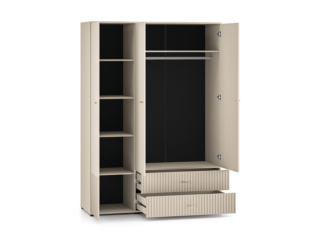 Die hochwertige Verarbeitung mit MDF-Fronten in Kaschmir-Optik, goldfarbenen Metallgriffen und dezenten schwarzen Füßen verleiht dem Möbelstück eine edle Note. Dank Soft-Close-Scharnieren und Vollauszugsschubladen bietet der Kleiderschrank auch höchsten Komfort im täglichen Gebrauch.