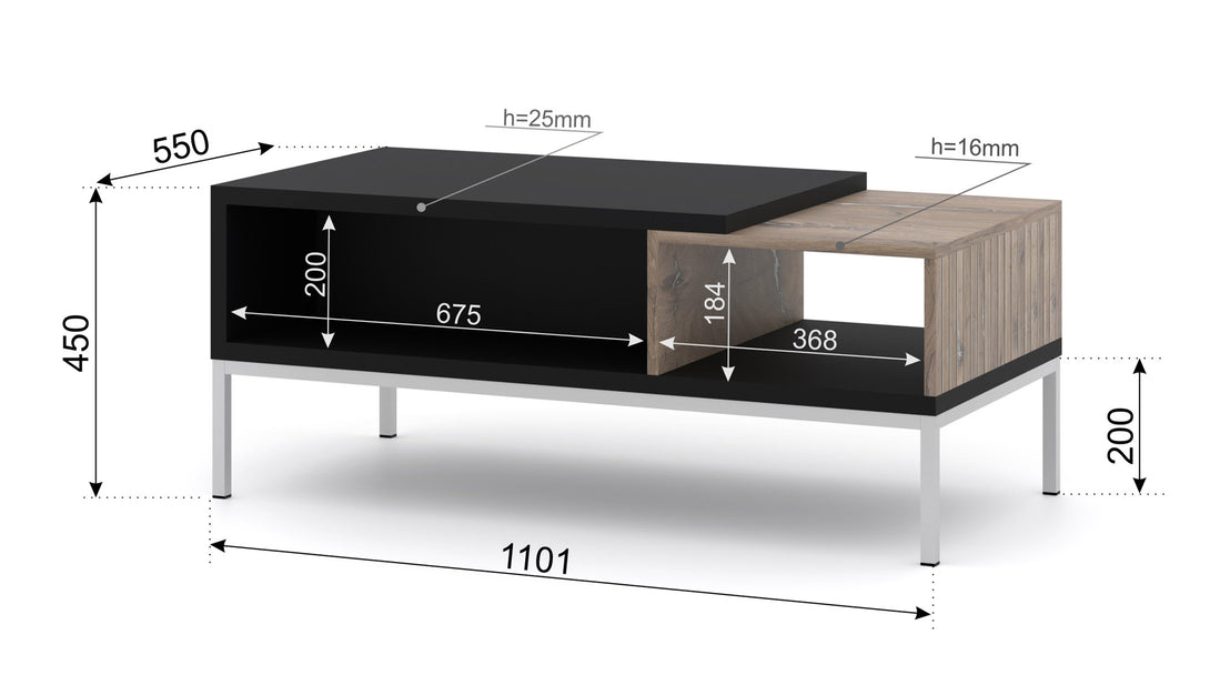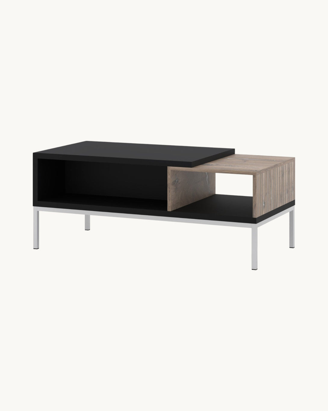 Der TOLEDO Couchtisch vereint rustikale Eleganz mit modernem Design. Die Kombination aus Flagstaff Eiche, mattem Schwarz und silbernem Metallgestell sorgt für einen zeitlosen Look in Ihrem Wohnzimmer.