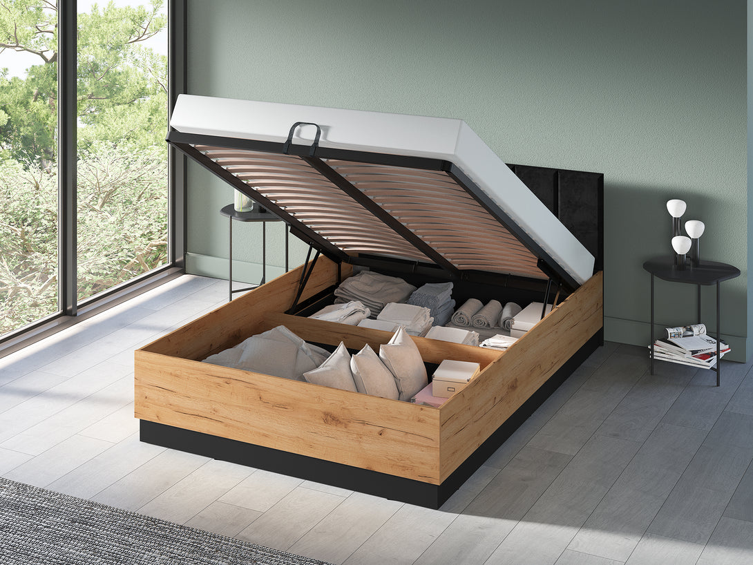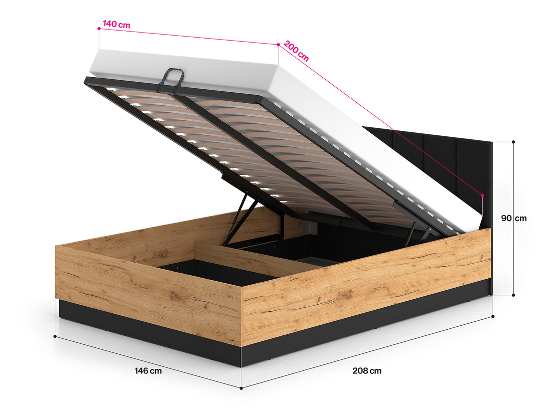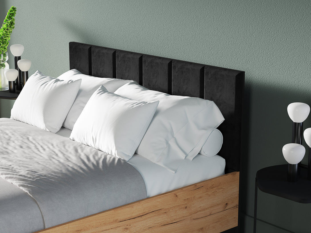 Die URSO Bettenserie umfasst vier stilvolle Modelle: URSO 1301 und URSO 1302 mit einer Breite von 145 cm sowie URSO 1401 und URSO 1402 mit einer Breite von 165 cm. Jedes Modell bietet ein elegantes Design in Gold Craft Oak mit schwarzem Samtkopfteil und integriertem Rahmen für optimalen Komfort. Die Betten unterscheiden sich in der Anzahl der Packstücke und im Gesamtgewicht, teilen jedoch dieselbe hochwertige Verarbeitung und moderne Optik. Dank der gepolsterten Rückenlehne in edlem Schwarz und der stabilen Konstruktion sind diese Betten die perfekte Kombination aus Ästhetik und Funktionalität. Die Modelle werden ohne Matratze geliefert, sodass Sie Ihre persönliche Schlaflösung frei wählen können.