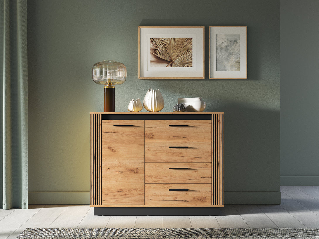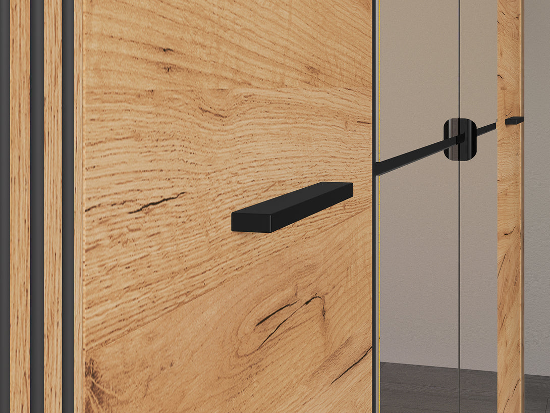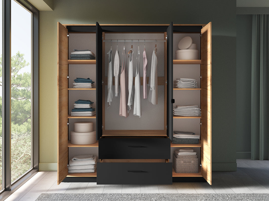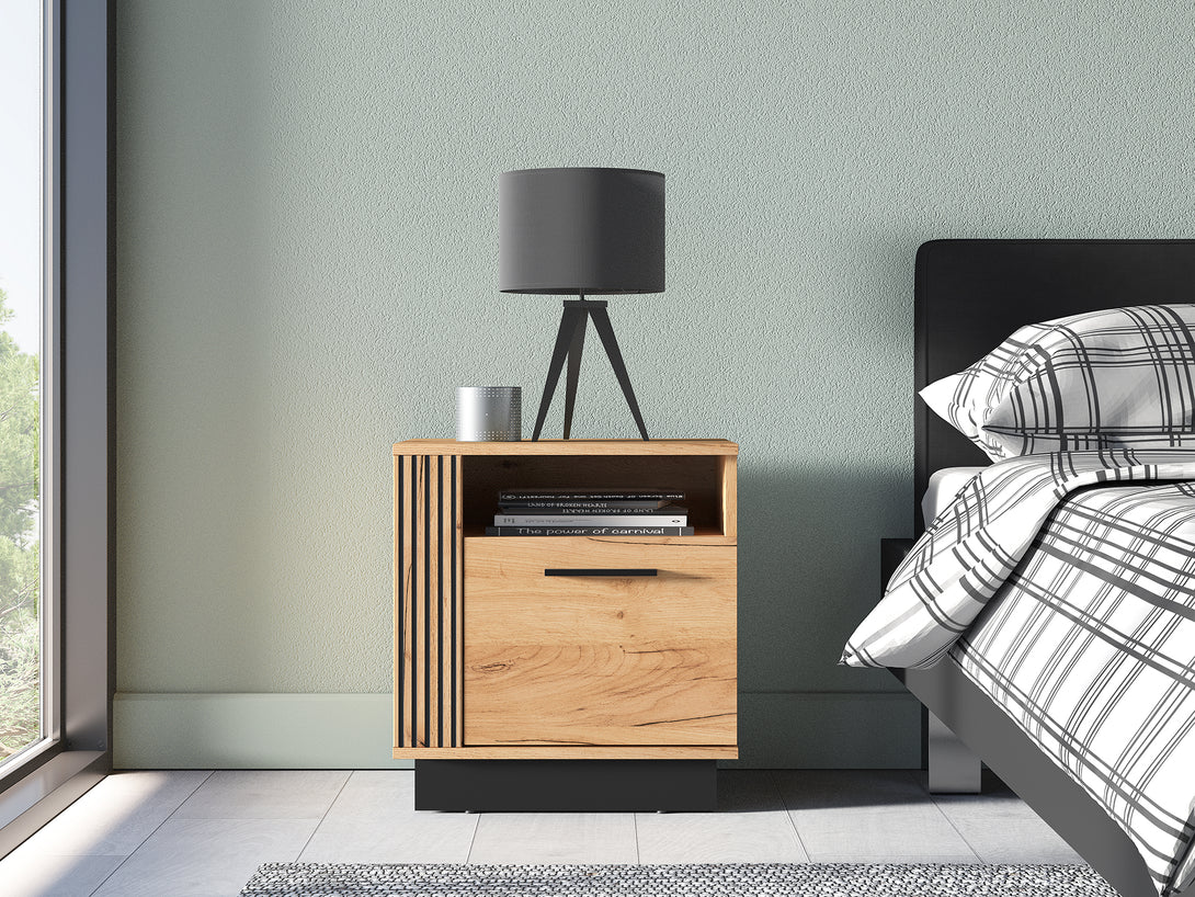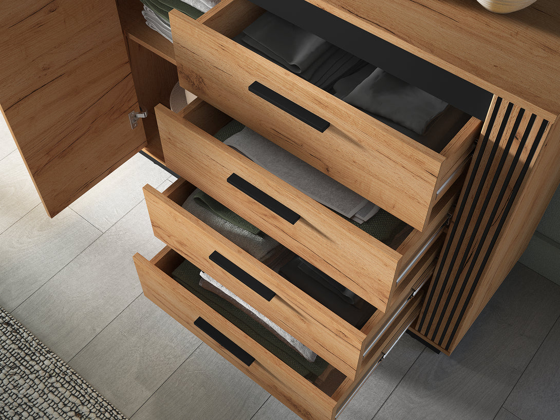Das hochwertige URSO Schlafzimmer-Set umfasst fünf sorgfältig gefertigte Möbelstücke in der modernen Farbkombination Dąb Craft Złoty und Schwarz. Gefertigt aus erstklassiger laminierter Spanplatte mit robusten ABS-Kanten, garantieren die Möbel Langlebigkeit und einfache Pflege. Ausgestattet mit leisem Soft-Close-System bieten die Schränke und Schubladen eine komfortable Nutzung. Das Set kombiniert funktionalen Stauraum mit elegantem Design und ist ideal für stilbewusste Schlafzimmer.