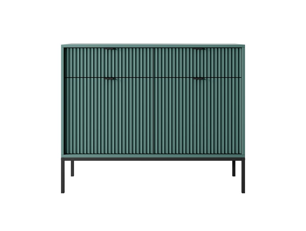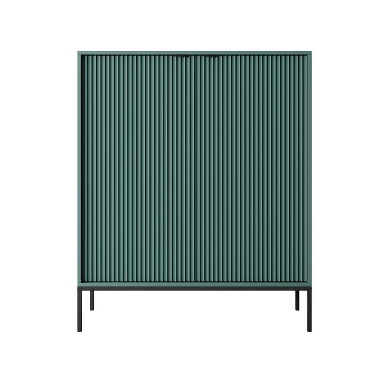 Das Wohnzimmer Set NOVA in Grün vereint ausdrucksstarke Farbgebung mit klarer Formsprache und durchdachten Stauraumlösungen. Die Kombination aus Hochkommode K104, TV Lowboard RTV154, Kommode KSZ104 und Couchtisch L104 bildet ein harmonisches Ensemble, das Wohnräume strukturiert und optisch aufwertet. Die gerillten Fronten betonen die vertikale Linie und verleihen den Möbeln eine ruhige, zugleich markante Oberflächenwirkung. Das TV Lowboard bietet ein breites Gerätefach und geschlossene Bereiche für Technik und Zubehör, während der Couchtisch mit offenem Fach und geschlossenem Stauraum den Mittelpunkt der Sitzlandschaft bildet. Die Kommode KSZ104 stellt mit Schubladen und Türen ausreichend Platz für Geschirr, Textilien oder Alltagsgegenstände bereit, während die hohe K104 mit mehreren Regalfächern ideal für ordentliche Aufbewahrung von Kleidung, Akten oder Wohnaccessoires ist. Die matte grüne Farbgebung setzt einen modernen, wohnlichen Akzent und lässt sich hervorragend mit hellen Holzböden, neutralen Stoffen und natürlichen Materialien kombinieren. Dank der filigranen Metallgestelle wirken die Möbel leicht und erhöhen gleichzeitig die Stabilität im täglichen Gebrauch.