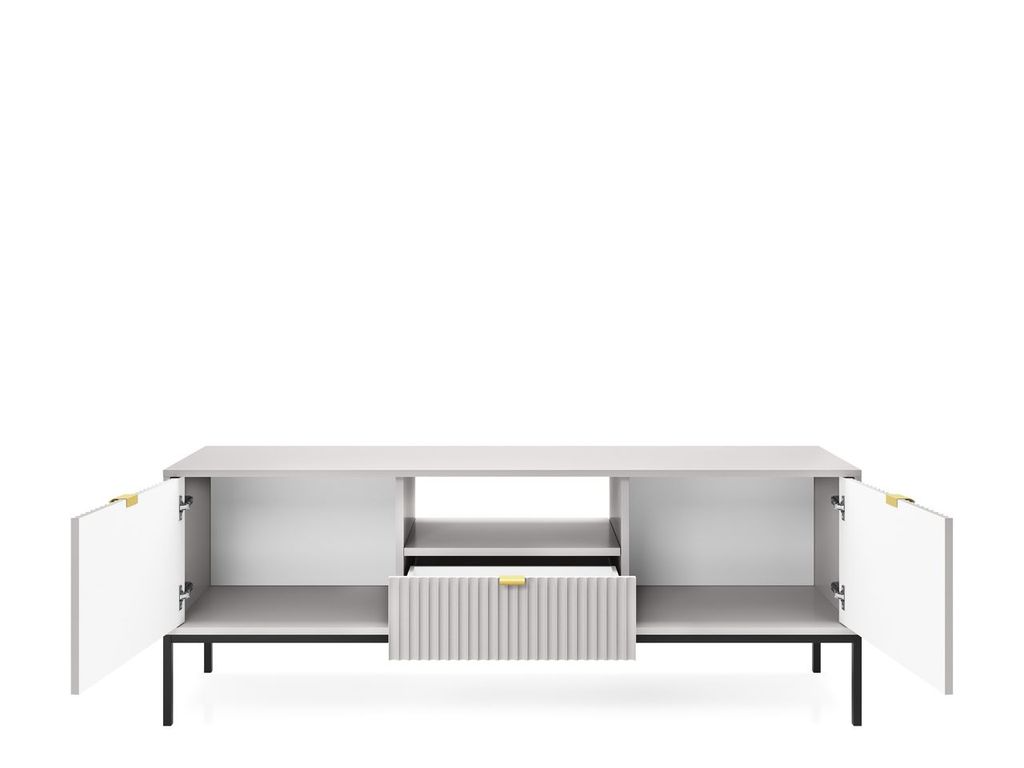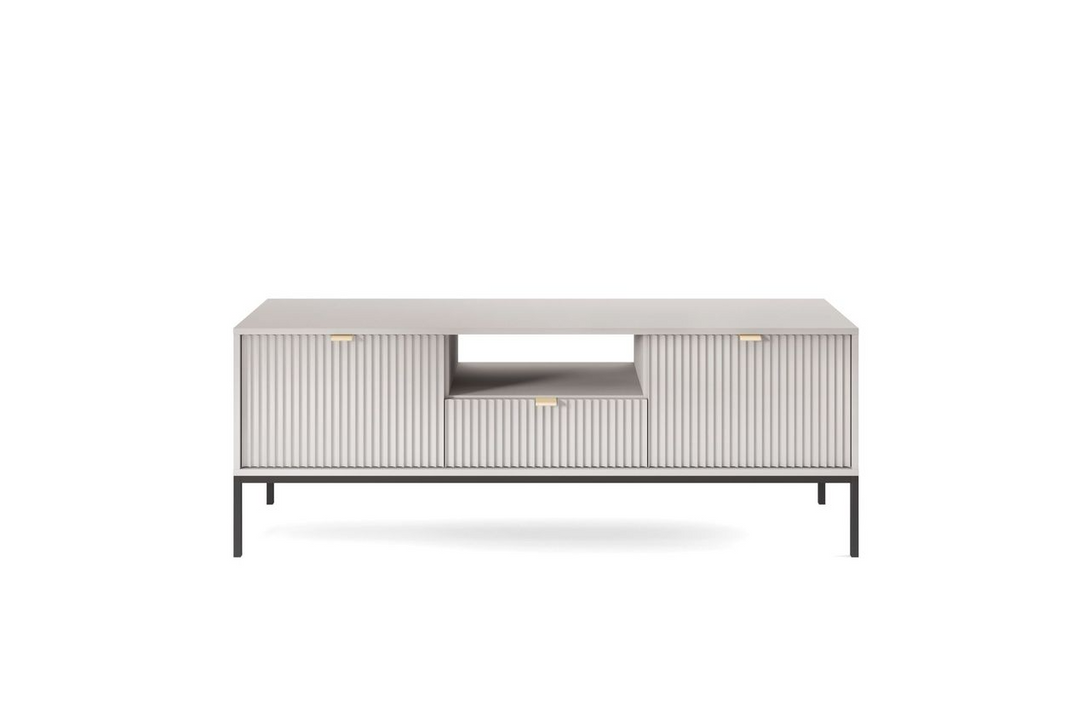 Dieses 5-teilige Wohnwand Set der NOVA-Kollektion in Grau verbindet einheitliches Rillendesign mit umfangreicher Stauraumfunktion und schafft ein harmonisches, modernes Wohnkonzept. Die breite Kommode KSZ154 bietet mit ihren vier Türen und oberen Klappen großzügigen Platz für Geschirr, Textilien oder Alltagsgegenstände. Das TV Lowboard RTV154 kombiniert eine elegante Rillenfront mit zwei Seitentüren, einer zentralen Schublade und einem offenen Multimediafach für Receiver, Konsolen oder Streaminggeräte. Der Couchtisch L104 ergänzt den TV-Bereich mit einer Rillenfront-Schiebetür und einem seitlichen offenen Fach, ideal für Zeitschriften, Fernbedienungen oder Deko. Zwei identische Hochkommoden K104 erweitern das Ensemble um hoch angeordneten Stauraum hinter breit öffnenden Doppeltüren, mit mehreren Innenfächern für Kleidung, Ordner oder Wohnaccessoires. Das ruhige Grau der Oberflächen, die vertikalen Rillenstrukturen und die schlanken schwarzen Metallgestelle verbinden alle fünf Elemente zu einem ästhetisch durchgehenden Set, das perfekt zu modernen, minimalistischen und skandinavischen Wohnbereichen passt.