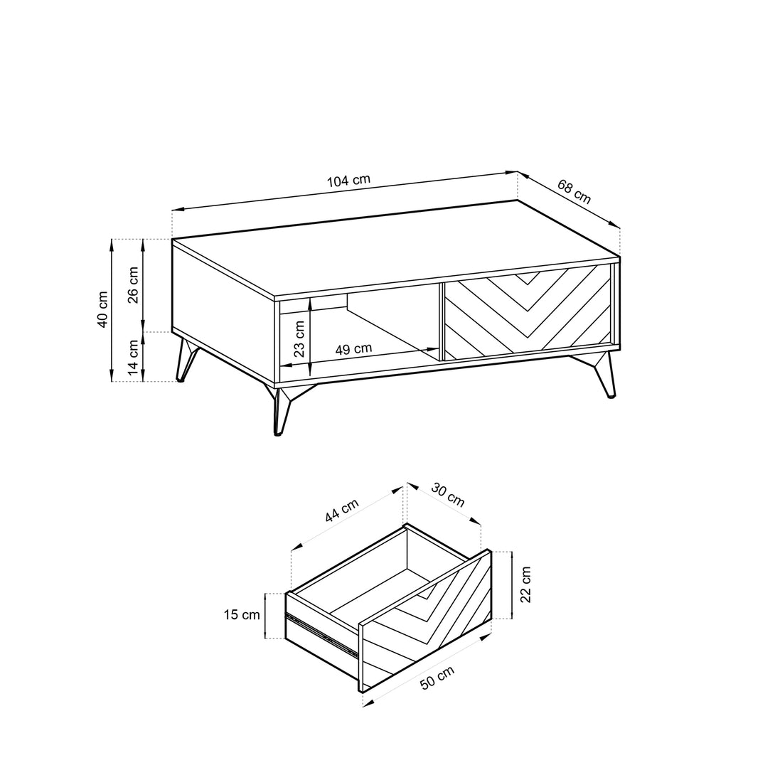 Das Set besteht aus zwei großzügigen Kommoden, die vielseitige Stauraummöglichkeiten für Geschirr, Textilien oder Alltagsgegenstände bieten, einem modernen TV-Lowboard für Multimedia-Geräte sowie einem Couchtisch mit offener Ablage und Schublade. Alle Elemente sind mit stabilen Metallfüßen ausgestattet, die nicht nur für hohe Standfestigkeit sorgen, sondern auch das leichte, moderne Erscheinungsbild unterstreichen. Die pflegeleichten Oberflächen garantieren Langlebigkeit im täglichen Gebrauch. Dieses Set eignet sich ideal für Wohnzimmer, in denen Ästhetik, Funktionalität und hochwertige Verarbeitung gleichermaßen geschätzt werden.