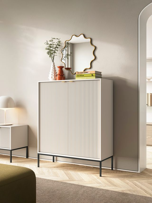 Das Wohnzimmer Set NOVA in Kaschmir kombiniert weiche, warme Farbnuancen mit klarer, moderner Formensprache. Die Kombination aus Hochkommode K104, TV Lowboard RTV154, Kommode KSZ104 und Couchtisch L104 bildet ein harmonisches Gesamtbild, das den Wohnbereich optisch strukturiert und zugleich viel Stauraum bietet. Die vertikal gerillten Fronten verleihen allen Möbeln eine ruhige, grafische Oberflächenwirkung, während die kaschmirfarbene Ausführung für ein wohnliches, einladendes Ambiente sorgt. Die Hochkommode nutzt die Raumhöhe optimal aus und bietet mit mehreren Fächern Platz für Wäsche, Akten oder Wohnaccessoires. Das TV Lowboard stellt ein breites Gerätefach sowie geschlossene Bereiche für Technik und Medien zur Verfügung und hält den TV-Bereich aufgeräumt. Die Kommode KSZ104 mit Klappen und Türen eignet sich hervorragend zur Aufbewahrung von Geschirr, Textilien oder Alltagsutensilien im Wohn- oder Essbereich. Ergänzt wird das Ensemble durch den Couchtisch L104, der offenes Ablagefach und geschützten Stauraum in einem kompakten Format vereint und damit den Mittelpunkt der Sitzgruppe bildet. Die schwarzen Metallgestelle heben die Körper optisch an, lassen die Möbel leicht erscheinen und gewährleisten zugleich eine robuste Basis für den täglichen Gebrauch.