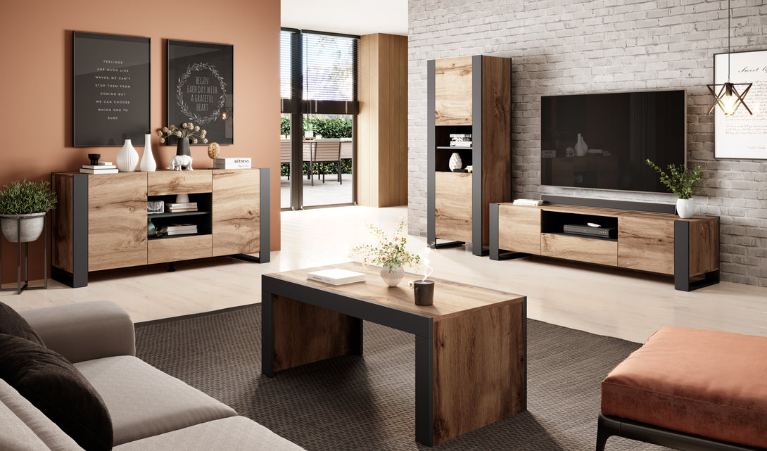 Das WOOD TV-Lowboard überzeugt mit einem modernen Design, das durch stilvolle Kufen in Anthrazit hervorsticht. Diese markanten Metallfüße umrahmen das Möbelstück und setzen einen eleganten Kontrast zur warmen Holzoptik der Fronten und Korpusflächen. Die harmonische Kombination aus Wotan Eiche und Anthrazit sorgt für ein gemütliches und zugleich modernes Wohnambiente.
